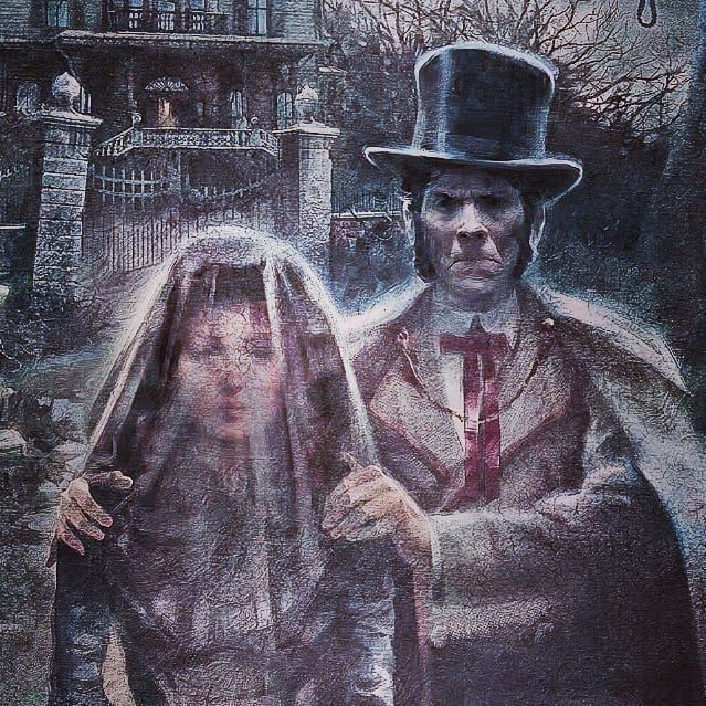 L’histoire de cette attraction commence avec la Famille Ravenswood, une riche famille vivant a Thunder, une ville fondée à la Frontière à la fin du 19 ème siècle, et un somptueux manoir situé sur la colline de Boot Hill, près d’un citière. Le père de cette famille, Henry, est une personne très possessive et n’apprécie pas que sa fille, Mélanie, une magnifique femme, se rapproche d’autres hommes. Durant sa vie, elle a eu quatre prétendants: Barny Claude, tué par un ours; Le Capitaine Roward D.Falls spécialiste de la navigation en rivière qui a chuté dans une cascade; Ignatius « Iggy » Knigh, un responsable de mines, soufflé par une explosion de dynamite provoqué par une allumette destinée à allumer a pipe. Et enfin Sawyer Bottom, qui a été tranché en 2 par une scie. Oui, tous les prétendants on été tués « naturellement ».