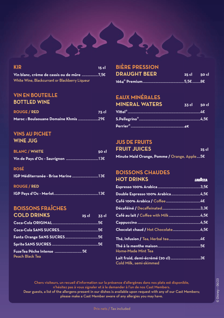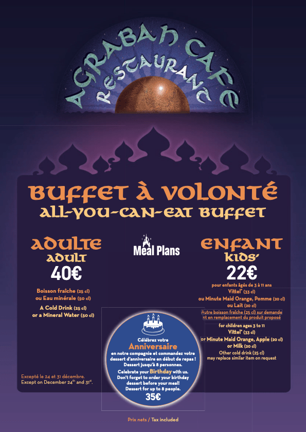 Entrez dans ce restaurant enchanteur qui vous transporte dans le monde d’Aladdin, non loin du célèbre passage d’Adventureland. Ce buffet à volonté vous propose de découvrir les délices de la cuisine méditerranéenne.