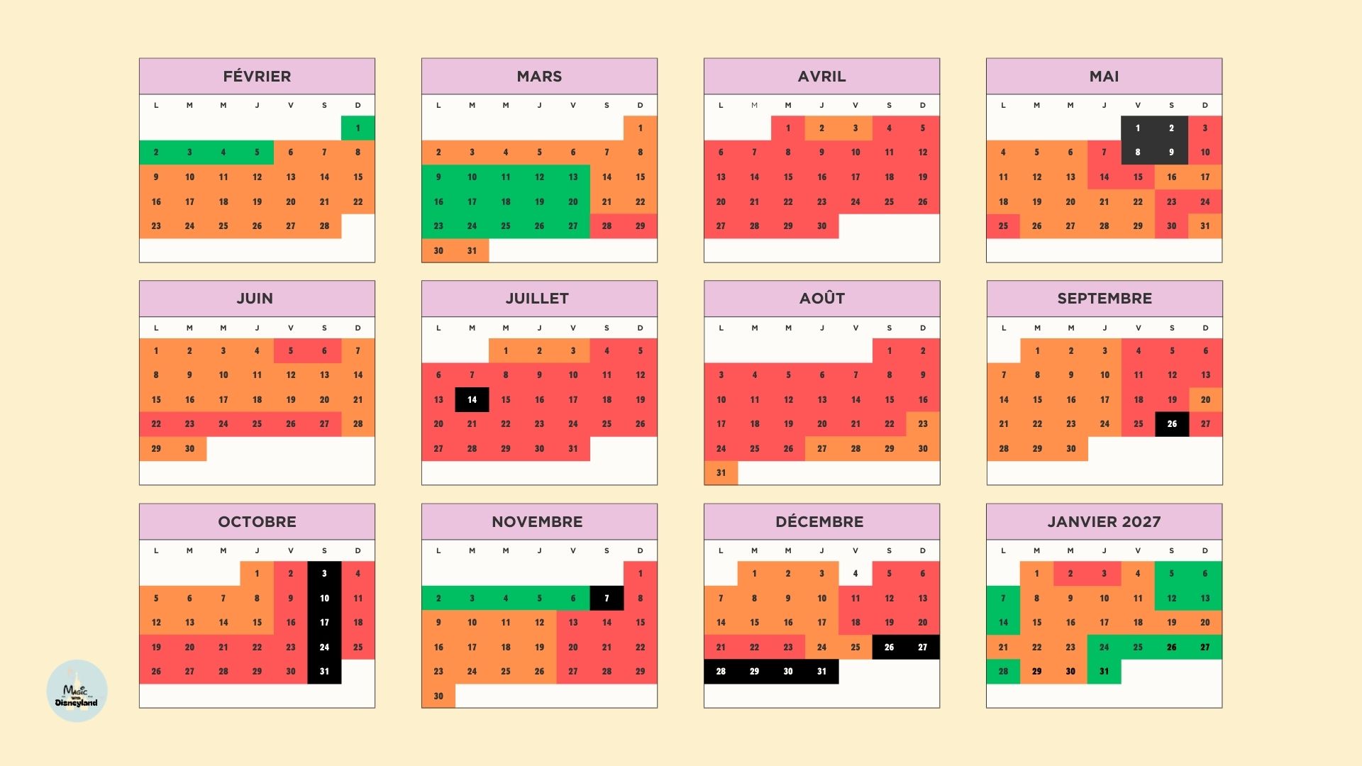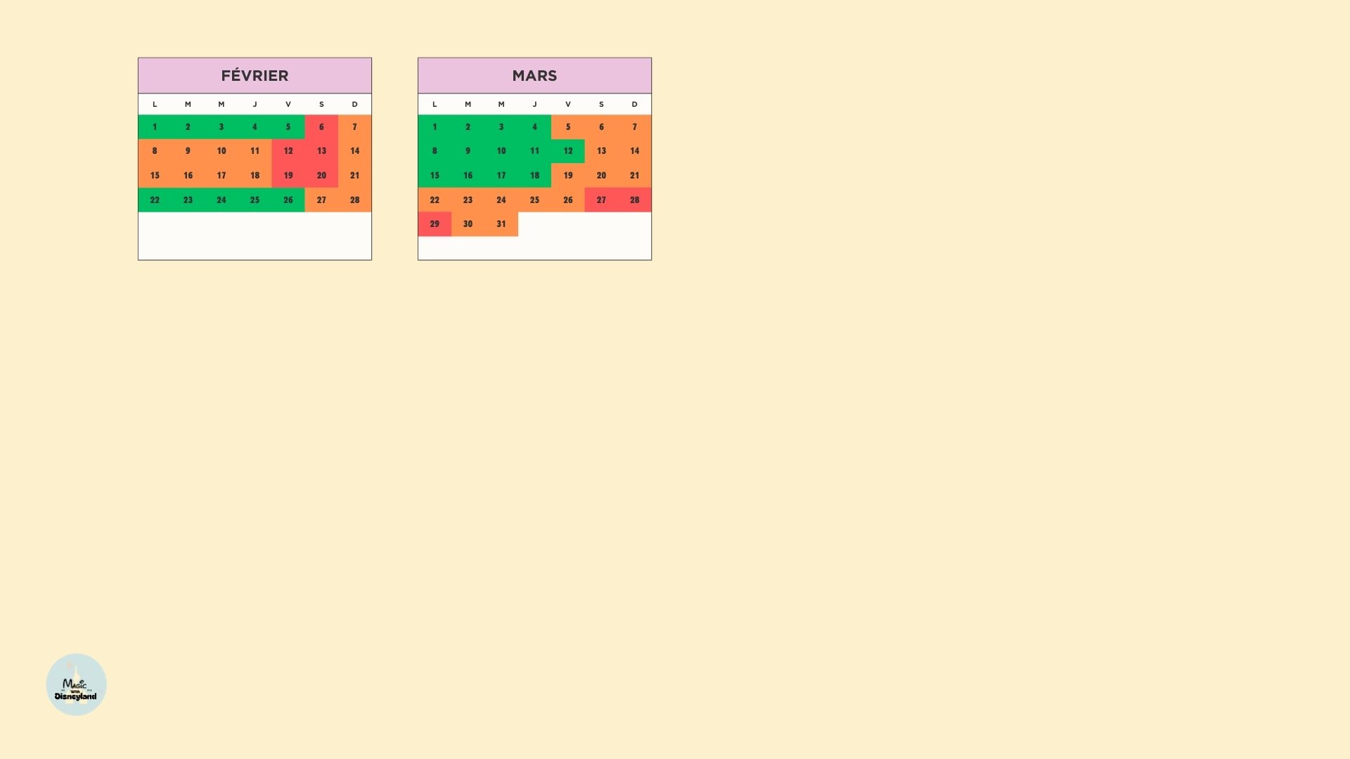 Comme chaque année, je te propose mon calendrier d’affluence complet pour t’aider à choisir les meilleures dates pour visiter les parcs Disney.