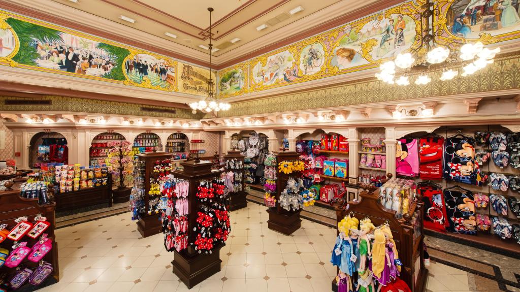 Sous un impressionnant plafond décoré de dessins « fin de siècle » et éclairé par des lustres anciens, cette boutique élégante abrite une magnifique collection de souvenirs du Parc Disneyland, des accessoires, des jouets et plus encore.